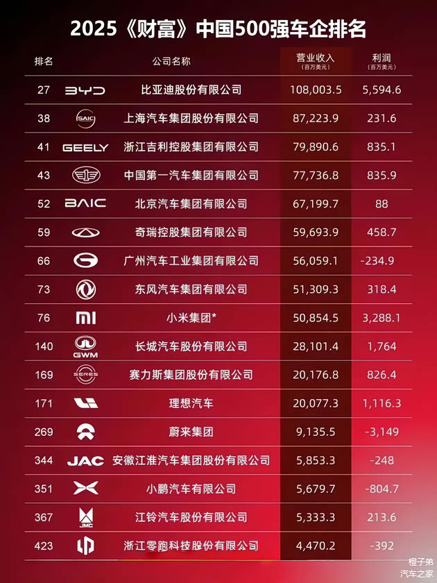 看 2025《财富》中国 500 强车企榜单,真是越品越有意思。新能源车企和传统车企的利润表现简直是两个极端,传统大厂营收动辄几十亿美元,利润却低得可怜,上汽营收 870 多亿美元,利润才 2.3 亿美元,北汽更是只有 8800 万美元,反观新能源阵营,比亚迪狂赚 55.9 亿美元,理想和赛力斯营收相近,利润却差了近 300 万美元。