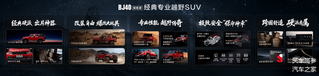 北京越野董事长王昊表示,BJ40作为中国越野的领路者,亲历过无数盛事荣耀,也成为中国汽车的独特文化符号,在全球用户的认可中走入了万千家庭。BJ40以探险家的名义,开启全新征程,在经典设计、自由改装、专业性能、极致安全和跨圈舒适五大维度再造新经典,为中国越野车市场再造经典专业越野SUV。