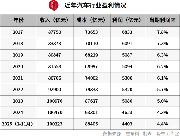 根据中国汽车流通协会乘联分会秘书长崔东树发布的数据,2025年1-11月,汽车行业收入为100223亿元,同比增长8.1%,汽车行业利润率为4.4%,相对于下游工业企业利润率6%的平均水平,明显偏低。