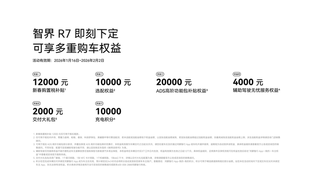这次新春限时权益就是最好的证明。1月16号到2月2号,全系车型能享最高12000元购置税补贴,还能直接抵扣尾款。更给力的是,智界R7综合购车权益最高能到49000元,智界新S7直接冲到59000元的上限。