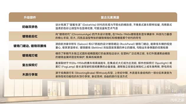 西西里假日套件更藏巧思,复古探照灯复刻经典跑车设计,木质行李架承载自由旅行情怀,镀铬前后杠、腰线与尾灯框致敬黄金镀铬时代,搭配方中带圆的精致电眼大灯,让出行工具秒变复古风尚符号。