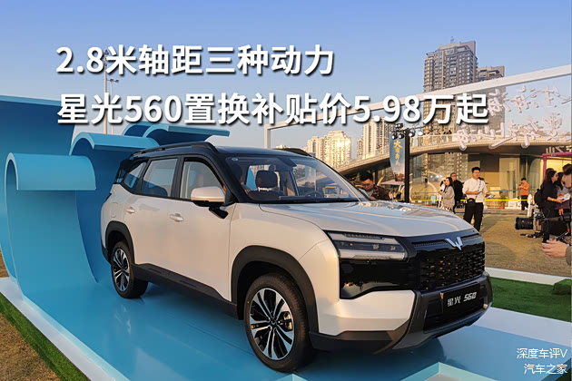 1月15日,上汽通用五菱宣布旗下全新紧凑型SUV星光560正式上市。新车基于天舆架构打造,共推出四款配置车型,提供燃油、插混、纯电三种动力形式,上市指导价为6.28万-9.88万元,置换补贴价为5.98万-9.58万元。