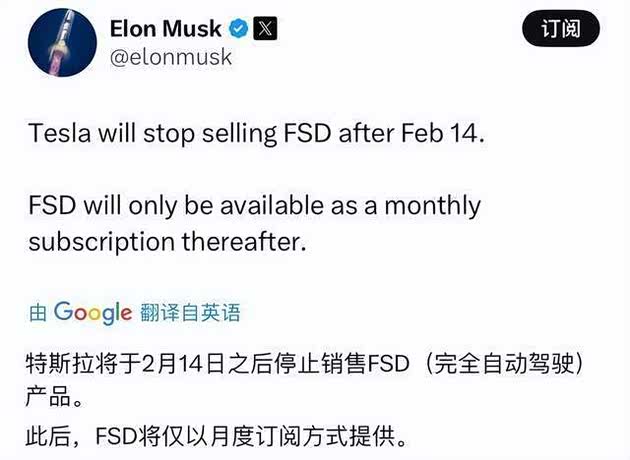 1月14日,马斯克在其社交平台上宣布了一项重大决策,自2026年2月14日起,特斯拉将在全球市场停止销售其完全自动驾驶FSD功能的一次性买断版本,该功能此后将仅通过月度订阅模式提供。