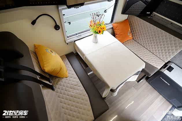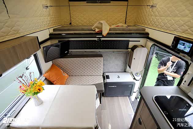 空间布局的灵活性令人赞叹:中部对卡座桌板降下后可变身舒适睡床,前方抽拉床则进一步提升了睡眠承载能力,满足多人出行需求。
