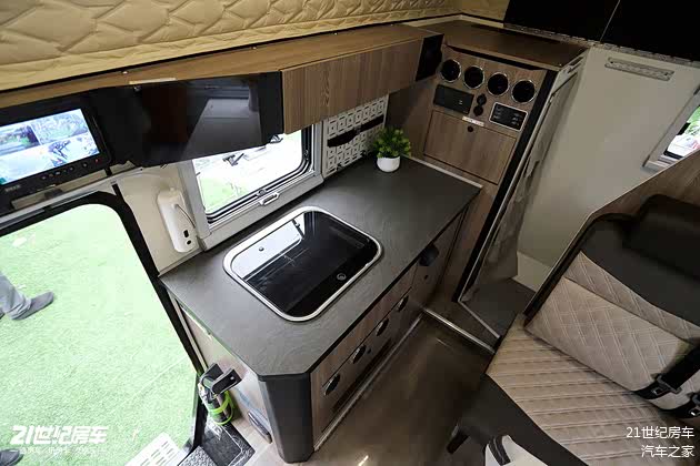 对面厨房区配置洗菜池、电磁炉、微波炉,烹饪基础需求一应俱全,上方四路监控显示屏让户外环境一目了然,旁边的洞洞板则为厨具、调料提供了便捷收纳方案,让烹饪区域整洁有序。