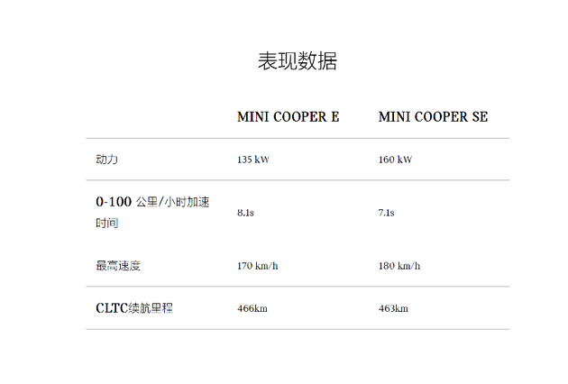 动力和续航方面,MINI电动分COOPER E和COOPER SE两个版本,CLTC续航分别是466km和463km(数据源自MINI中国官网2026年1月最新公示),动力参数对应135kW和160kW,0-100km/h加速时间8.1秒和7.1秒,最高车速170km/h和180km/h。这个续航在城市里完全够用,就算周末短途出游也不用慌,支持95kW直流快充,10%-80%补能仅需30分钟,上班间隙补电很方便,家用11kW交流电充电从0-100%需5.5小时。