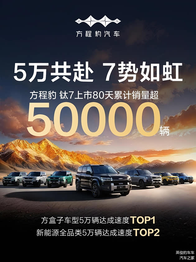 如果说豹5是方程豹敲开市场大门的“开山之作”,那么钛7就是其“爆款基因”的最佳诠释,也让更多普通家庭读懂了“硬派越野”的另一种可能。这款定位20万级家用硬派SUV的车型,自2025年9月9日上市以来,仅用80天就斩获超5万辆订单,直接刷新方盒子车型的销量纪录,成为细分市场的现象级产品。它的走红,藏在每一个贴合用户需求的细节里。