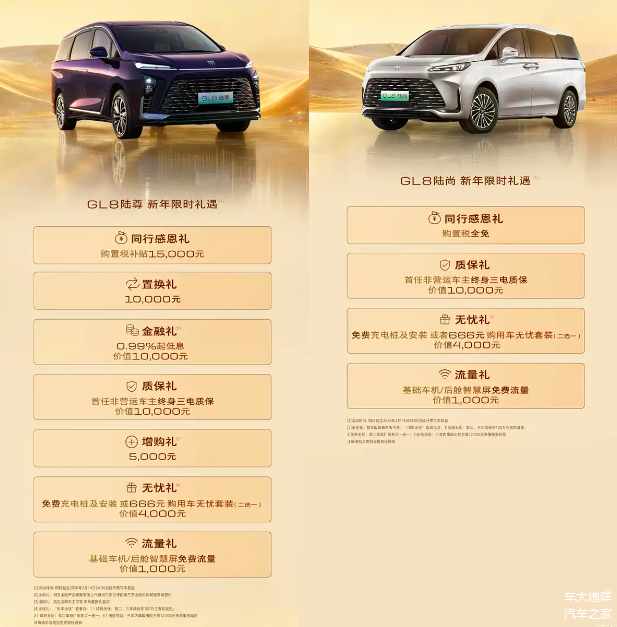 1月16日,上汽通用别克官方宣布,针对别克GL8陆尚和别克GL8陆尊推出新春购车优惠政策,即日起至2026年2月14日下定,可享至高1.5万元购置税补贴等权益。其中,别克GL8陆尚购置税全免,别克GL8陆尊提供1.5万元购置税补贴,同时两款产品还享受价值1万元的终身三电质保、价值4千元的无忧礼和1千元的免费流量等,详情可咨询当地别克经销商。