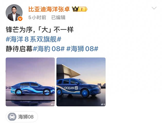 近日,比亚迪海洋网总经理张卓发布了全新8系双旗舰—— 海豹08与海狮08的官方谍照。