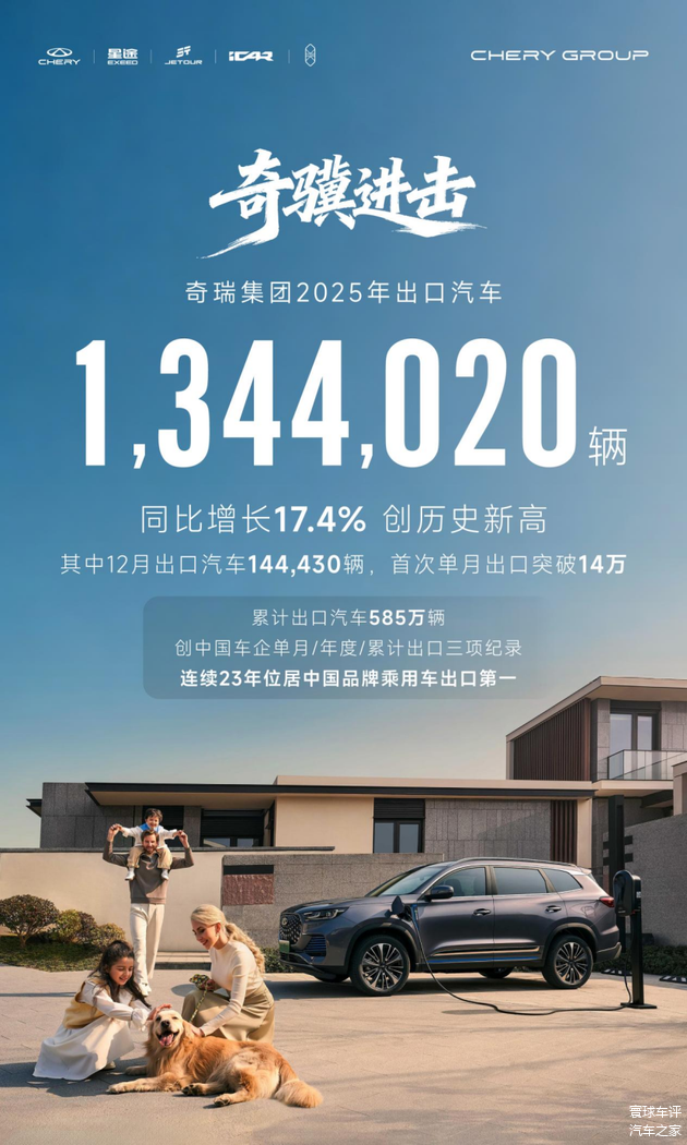 过去的一年,奇瑞的全球化能力也得到了进一步的放大。数据显示,其12月单月出口达到14.4万辆,同比增长46.8%,首次突破14万辆的单月出口大关;全年出口达到134.4万辆,同比增长17.4%;累计出口585万辆,这三项数据均刷新了中国车企的出口纪录。截至目前,其业务已覆盖全球120多个国家和地区,全球用户累计达到1853万。这不仅展示了奇瑞在全球市场的深厚积淀,更意味着它的领先地位已经超越了单纯的“窗口期红利”,而是通过持续的战略布局和品牌价值积累,打造了难以轻易复制的全球化护城河。