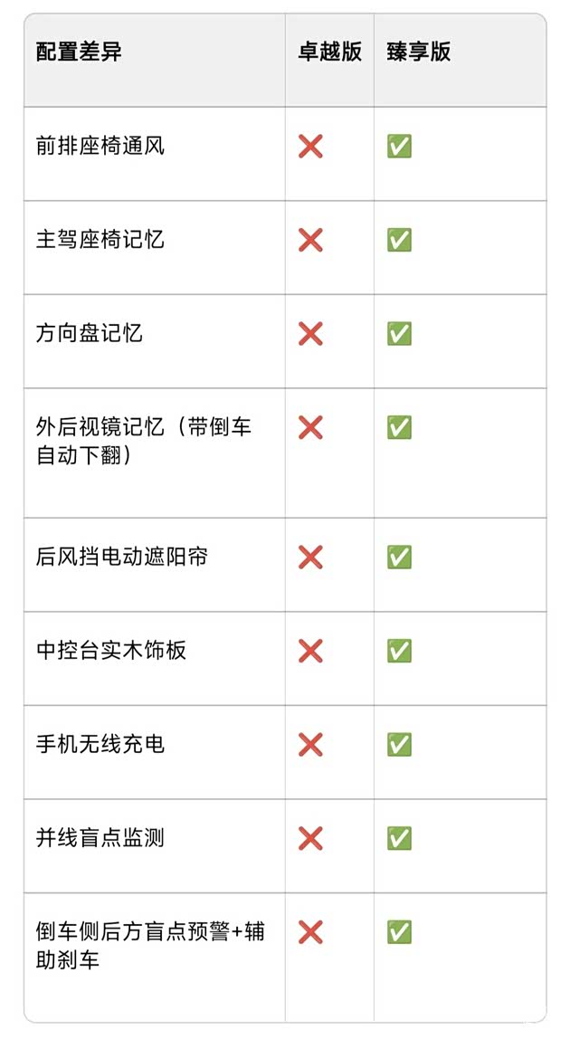 臻享版比卓越版多了8个实用配置,而且每一个都是日常用车能用到的,不是那种华而不实的配置。比如前排座椅通风,夏天真的太刚需了;并线盲点监测和倒车辅助刹车,能大大提升行车安全;手机无线充电、座椅记忆这些配置,能提升用车的便利性和质感。所以在淘车的时候,我更推荐大家选臻享版,二手车更值得入手。