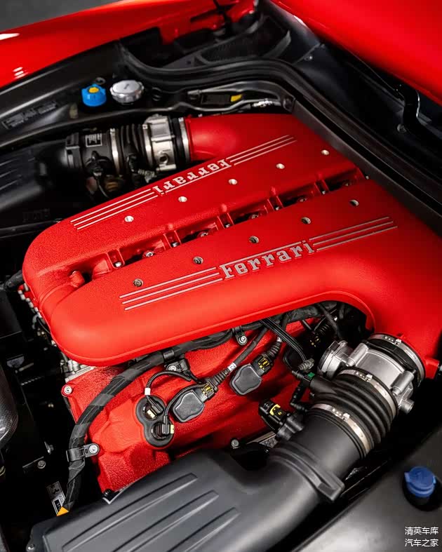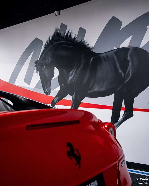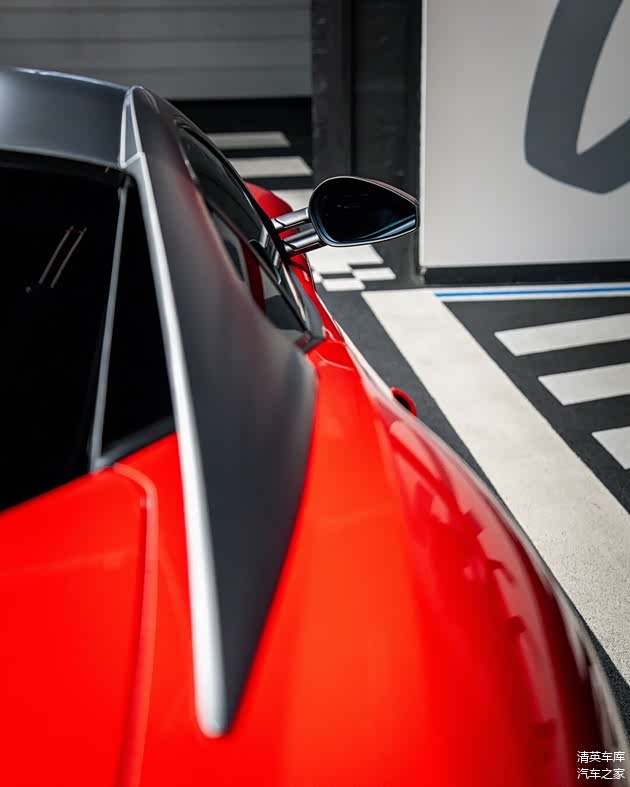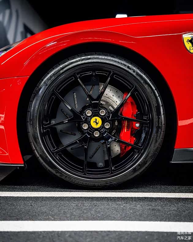 本次展示车型采用Rosso Corsa红车漆与哑光深灰双色涂装,凸显凌厉的车身线条与空气动力学设计,亮黑色轮毂搭配Rosso Corsa红红色制动卡钳,形成鲜明而大胆的竞速风格对比。