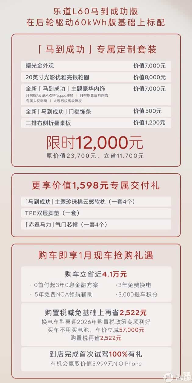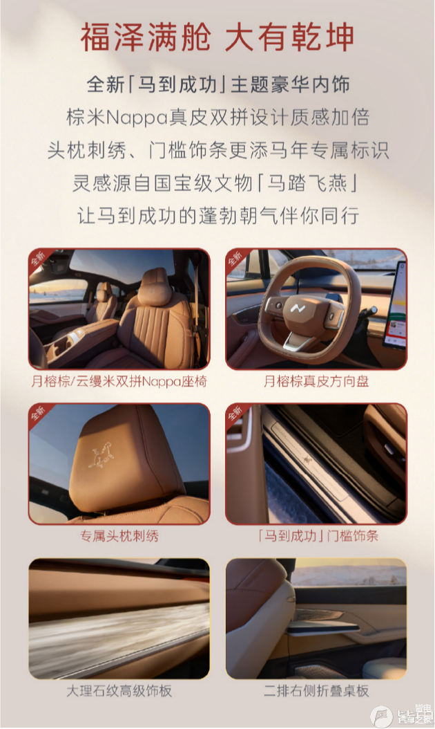 而此次马到成功版还推出多项购车权益,包括赠送3000提车积分、5年NOA领航辅助、金融贴息方案及专属舒享套装等。