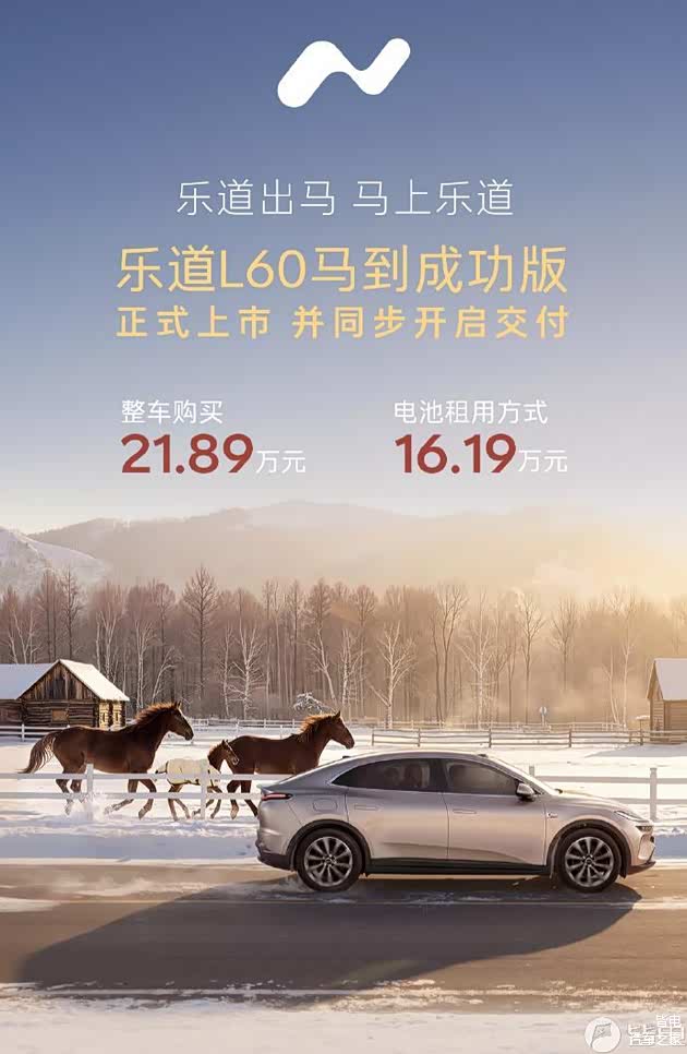 1月16日,乐道汽车官宣 乐道L60马到成功版正式上市并同步开启交付,整车购买方案售价21.89万元,电池租用方案售价16.19万元。