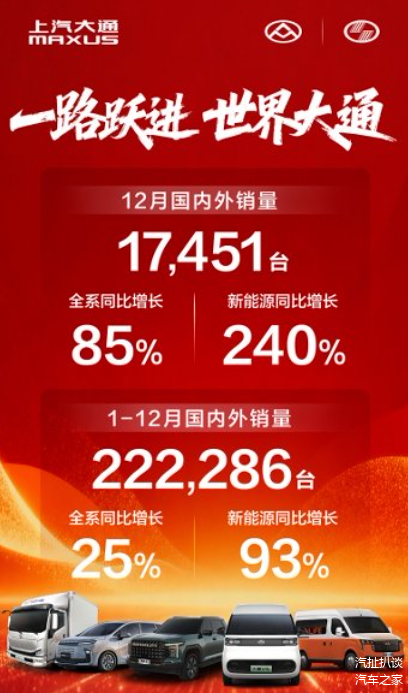 具体来看,上汽大通轻客板块全年热销9.3万辆,同比增长30%,持续巩固“中国轻客第一品牌”市场地位,出口量登顶行业第一;皮卡板块全年热销近5.7万台,稳健增长14%出口量稳居中国品牌第二,以高品质路线在全球皮卡高地“插旗立标”;上汽大通旗下跃进品牌轻卡全年热销4万辆,同比增长近128%,新能源车型交付超2.1万辆,引领轻卡行业绿色升级。