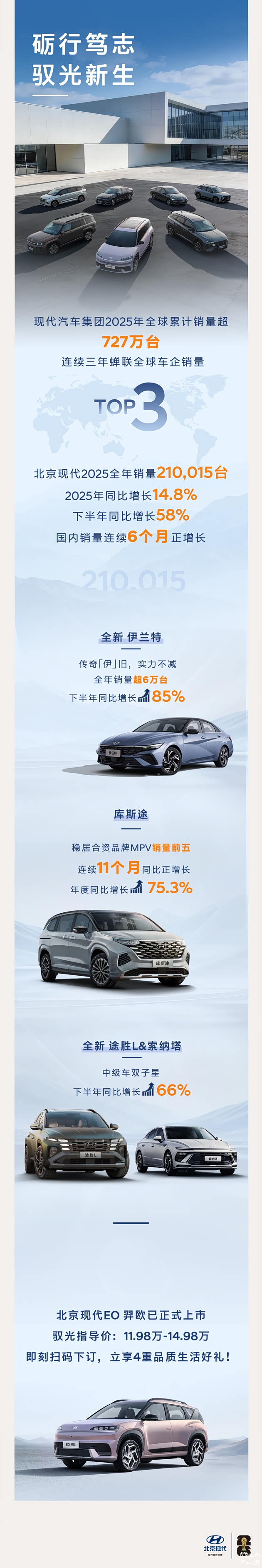 深耕中国市场23年,北京现代已收获超1200万用户认可,2025年销量达21万辆,连续6个月实现正增长。未来,北京现代将以 “智启2030计划” 为指引,坚持 “油电并举” 策略,继首款纯电平台SUV EO羿欧上市后,推出更多适配中国市场的新能源车型。同时,加码中南美、哈萨克斯坦等海外市场布局,优化渠道与服务体系,全力打造合资车企高质量转型标杆。