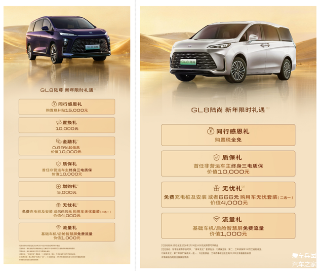 当然,也要再次强调,购买新能源GL8陆尚和新能源GL8陆尊的朋友,不同车型之间的权益是不一样的,GL8陆尊限时权益包含:1.5万元购置税补贴、价值1万元的终身三电质保、价值1万元的低息金融礼、价值1万元的置换礼或价值5千元的增购礼、以及价值4千元无忧礼和1千元的免费流量。