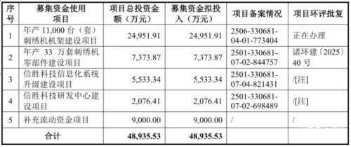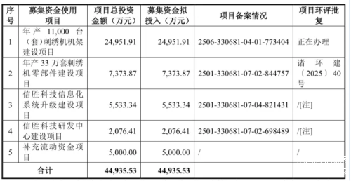 本次IPO,信胜科技拟募资4.49亿元,其中2.50亿元用于年产11000台(套)刺绣机机架建设项目,7373.87万元用于年产33万套刺绣机零部件建设项目,5533.34万元用于信息化系统升级,2076.41万元用于研发中心建设,5000万元用于补充流动资金。