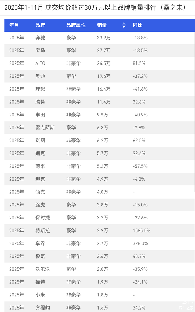 据中国汽车流通协会专家委员会成员李颜伟(笔名“桑之末”)所发布的数据,奔驰在2025年成交均价超过30万元的品牌当中销量依然领先。奔驰在2025年的单月成交均价长期保持在40万元以上,依然明显领先于均价最高的中国品牌问界。