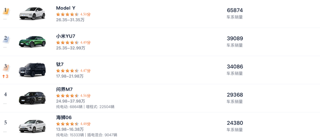 这个长期霸榜第一名的特斯拉Model Y这个月销量再创神话,随着最近推出的7年免息政策预计后期的销量还会持续上涨。当然,Model Y的产品力确实也很强,最长续航可达800公里以上,零百加速最快4秒3,百公里耗电量12kWh左右,做到动力强劲能耗偏低,最推荐长续航后轮驱动版,来一次跨省出游也不会有里程焦虑。