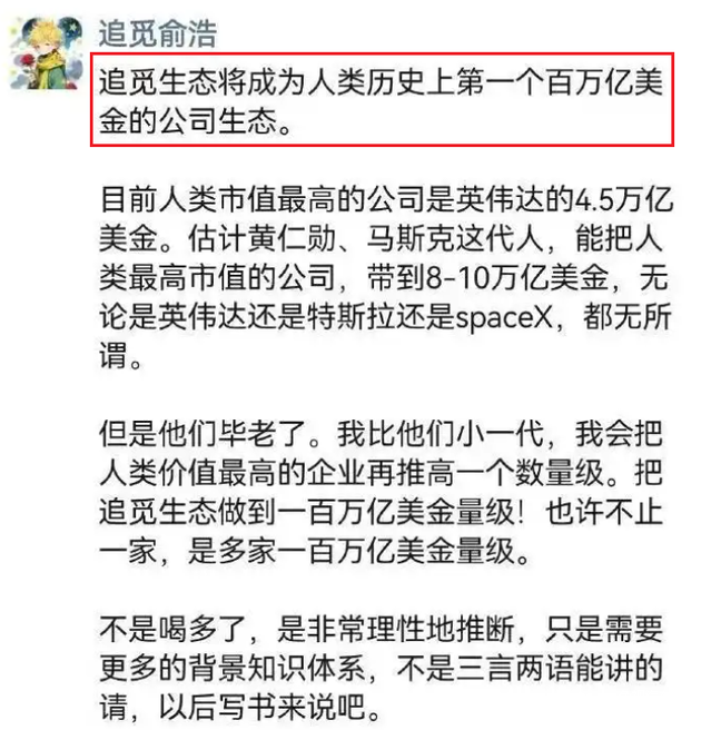但日前有一个中国老板俞浩夸下海口:“追觅生态将成为人类历史上第一个百万亿美金的公司生态。”