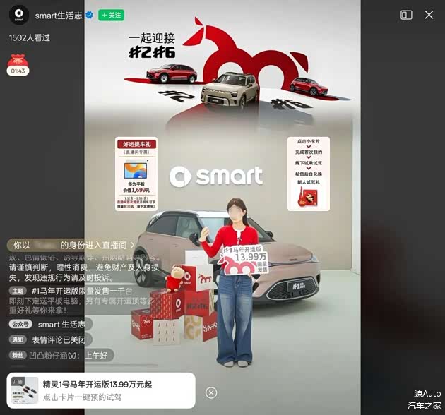 事实上,smart为了在马年开运版精灵1号上实现新年开门红已经十分努力。据源Auto观察,从元旦马年开运版精灵1号上市起的14天内,smart品牌官方直播间有9天为该车开播带货,但从实际销量来看似乎收效甚微。