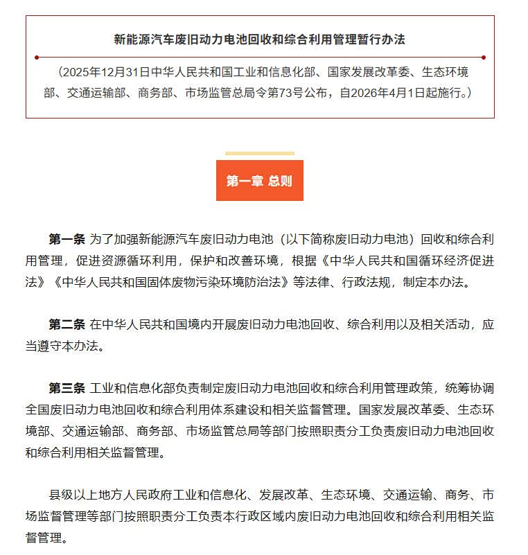 3、废旧动力电池综合利用是指什么?对废旧动力电池进行拆解、破碎、分选、冶炼等处理,进行资源化利用的活动。