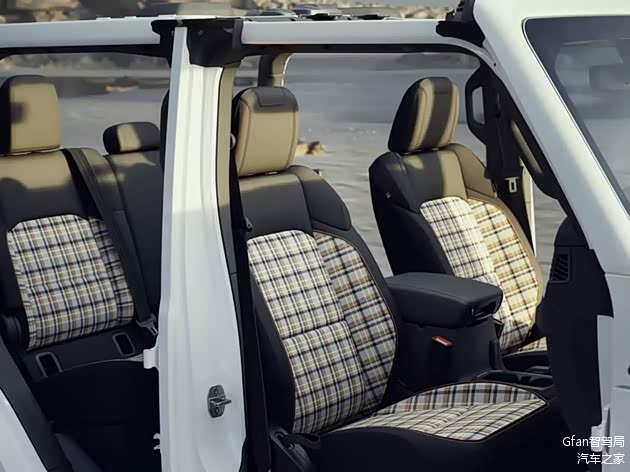 外观整体传承牧马人经典造型,车身同色挡泥板搭配17英寸轮圈,青铜色拖车钩成为视觉亮点,用户可选择黑色或车身同色车顶,兼顾个性化需求。内饰搭载黑白格子纹织物座椅,风格复古且辨识度拉满,换挡旋钮、门板等位置嵌入“85周年”专属徽章,仪式感十足。