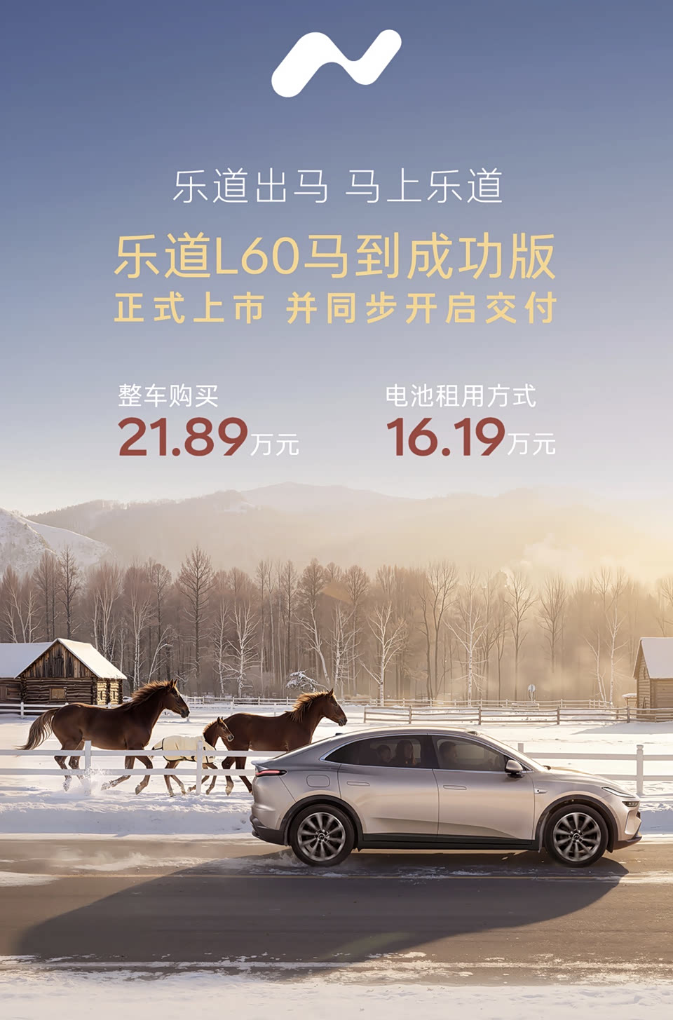 今儿乐道L60马到成功版 正式上市并开始交付 整车价格21.89万、BssS租电的话16.19万 有啥特别的地方呢? 曙光金外观色、20寸的亮银轮圈 这儿有个小彩蛋,气门芯帽换成马形状的了 全新月榕棕与云缦米双拼Nappa内饰 “马到成功”的头枕刺绣、门槛饰条与车机主题 锁车专属的提示音有了 还有后排右侧的折叠桌板 以上这些,现在限时12000就可以选装了 然后整个1月份 3年0息、3年免费换电 5年免费NOA、3000提车积分 过年回家高速怕堵,换电很香的