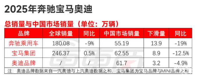 上述这些数字意味着,BBA三家豪车品牌去年在华累计销量,较2024年锐减约26万辆,整体降幅达到12.3%。