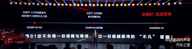 2026年1月15日晚,北京越野旗下的北京81 2.0共创版车型正式首发亮相,同时会员用户“方盒阵地”北京81会员平台小程序也正式上线。其量产版车型将分为“常规版”与“专业版”两类,将于4月份举办的2026北京车展上正式发布并开启预售,预计8月份上市。