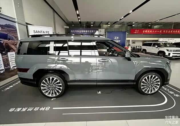 2026款胜达在外观上延续了第五代车型的设计语言。现代汽车全球统一的“One Model”方盒子造型让整车线条平直硬朗,进一步提升了车内的空间利用率。车头部分,贯穿式格栅与内部H型的像素式LED日间行车灯融为一体,构成了独特的前脸辨识度。新车还配备了主动式进气格栅,能够根据发动机工况自动调节开合。车身侧面加入了不少凌厉立体的筋线勾勒,前后轮拱区域外扩的设计加上裙边的黑色饰条也增加了力量感。车尾设计则相对简洁,在车门相对靠下的位置配有H型尾灯组,中间由黑色饰条连接,车尾底部采用单边单出排气布局,带来了一种相对粗犷的硬派观感。