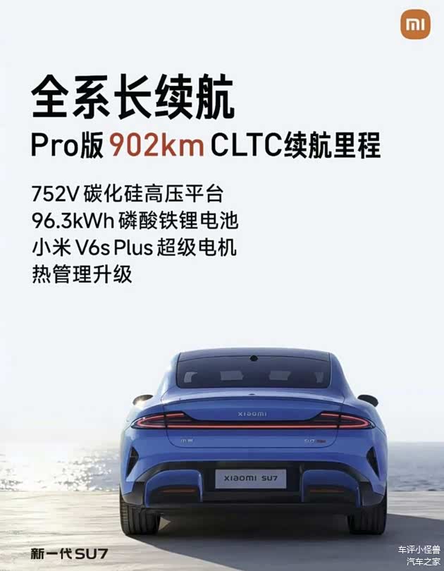 然后是Pro版本的CLTC续航里程直接给到902km,搭载的是752V碳化硅高压平台,性能更强,效率更高;搭载96.3kWh 磷酸铁锂电池;搭载小米V6s Plus超级电机;热管理升级,2026年新能源车开始卷续航了?纯电车有没有上1000的可能?
