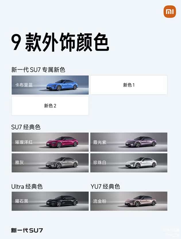 首先是配色上,提供9款外饰颜色和5款内饰颜色,其中外饰保留了上一代SU7的经典色,包括霞光紫、雅灰、璀璨洋红、珍珠白,同时引入YU7和Ultra的颜色,包括曜石黑、流金粉,还有三款全新的专属颜色,其中一款是卡布里蓝。