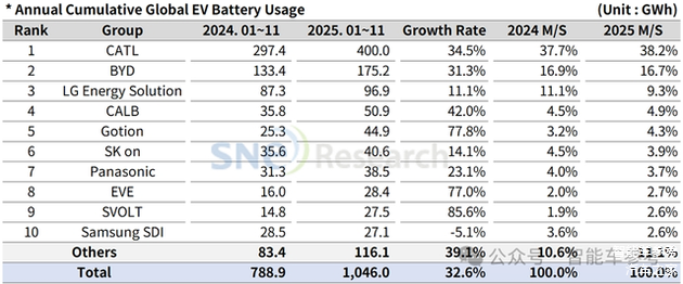 宁德时代和比亚迪霸榜前两名,宁德时代使用量达400GWh,市占率达38.2%;比亚迪使用量达175.2GWh,市占率达16.7%。