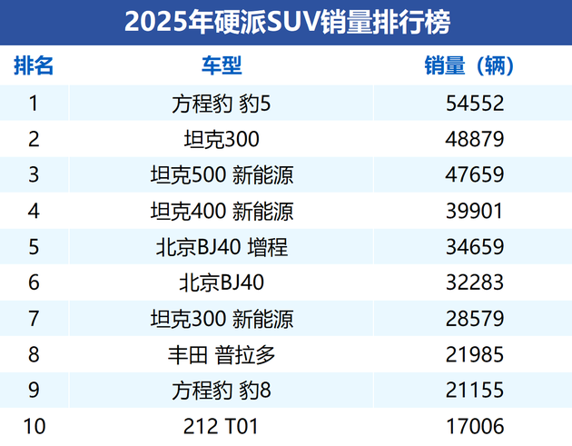 曾经的硬派SUV市场,基本上是合资品牌的天下, JEEP牧马人、丰田普拉多、福特烈马等都是公认的越野“标杆”。如今不少人还是十分推崇合资硬派SUV,但买的人却越来越少了。从2025年的硬派SUV销量榜来看,合资硬派SUV仅剩下丰田普拉多,其余的均为国产车。