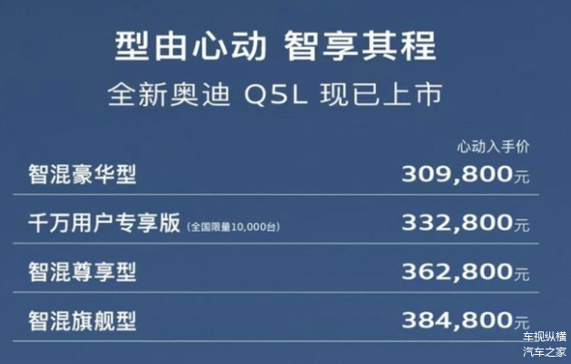 1月15日,全新一代 奥迪Q5L正式完成上市发布,以30.98万元的起售价推出四款配置车型,含全国限量1万台的千万用户专享版。作为奥迪品牌在华豪华中型SUV市场的核心产品,此次换代基于全新PPC豪华燃油车平台打造,在设计、空间、科技及动力维度完成全面革新,为当下燃油豪华SUV市场注入新的变量。