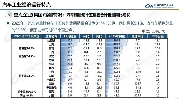 中国汽车工业协会的数据显示,2025年,国内汽车销量排名前十五位的集团销量合计为3174.1万辆,同比增长9.1%,占汽车销售总量的92.3%,低于去年同期0.3个百分点。其中比亚迪、上汽、吉利分别以460.2万辆、438.7万辆、359.8万辆排名前三,销量之和占总销量的比例为36.6%;如果加上一汽、长安、奇瑞、东风、北汽、广汽、长城七家,则国内汽车销量排名前十车企的销量之和占总销量的比例为83.9%,低于去年同期1个百分点。
