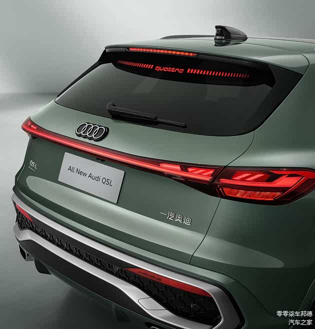外观设计方面,全新奥迪Q5L采用了奥迪品牌最新家族化设计元素,并提供两种风格可选,相比老款车型要更加年轻时尚。新车前脸依旧是标志性的大尺寸格栅设计,内部辅以蜂窝装饰点缀,高配车型还进行黑化处理,视觉效果更运动。同时,新车配备全新扁平化LOGO,两侧大灯组造型更细长,并搭载星辰矩阵大灯,拥有16个远光区控制,支持智能变光、动态流水转向、弯道补光以及迎宾灯语等功能,科技感十足。车身侧面更加修长,同时采用了全新样式的轮毂及半隐藏式机械门把手设计,符合主流审美需求。车尾部分采用贯穿式尾灯设计,内部集成了第二代数字OLED光源,可支持8款尾灯签名。车身配色方面,新车提供传奇黑、青城绿、茉莉白、曼达洛银和卡其棕共5款外观颜色可选。