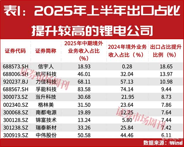 同样,在申万电池行业106只成分股中,有77家公司披露了2025年中期境外收入占比情况,其中华宝新能、浙江恒威、野马电池、孚能科技、派能科技、道氏技术、德赛电池等公司境外收入占比均在50%以上。对比2024年末数据,有45家电池公司海外收入占比实现提升,信宇人、杭可科技、力佳科技分别提升了18.65、13.97、10.98个百分点。