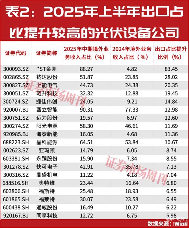 在光伏设备和电池行业,据Wind数据,目前申万光伏设备行业有70只成分股,其中2025年中期公布境外收入占比的公司达63家,艾罗能源、酉立智能、*ST金刚、阿特斯、晶科能源、阳光电源等公司的境外收入占比均达到50%以上。对比2024年末数据,上述63家公司中有39家的境外收入占比出现提升,其中*ST金刚、钧达股份、上能电气、琏升科技、捷佳伟创分别提升了83.45、28.02、20.35、19.45、14.84个百分点。