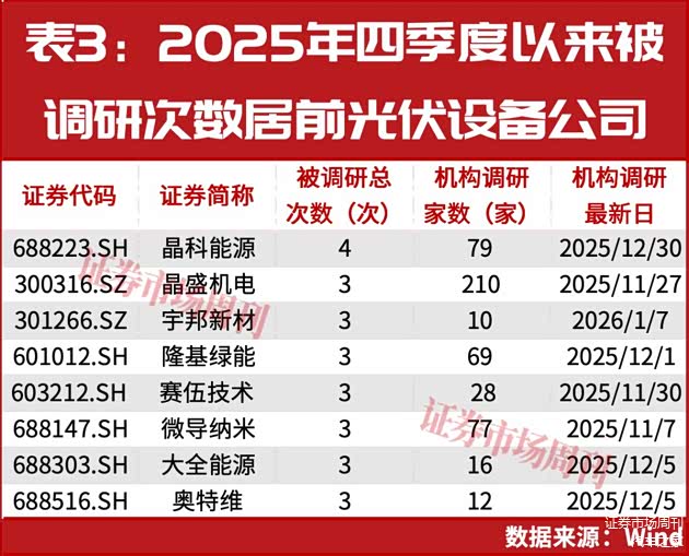 光伏设备公司中,晶科能源、宇邦新材、大全能源、奥特维等8家自2025年四季度以来被调研次数达到或超过3次。晶科能源被调研次数达到4次,在最新的一次调研中,投资人提问:“如何看待太空算力中光伏市场空间潜力和技术路线展望?”