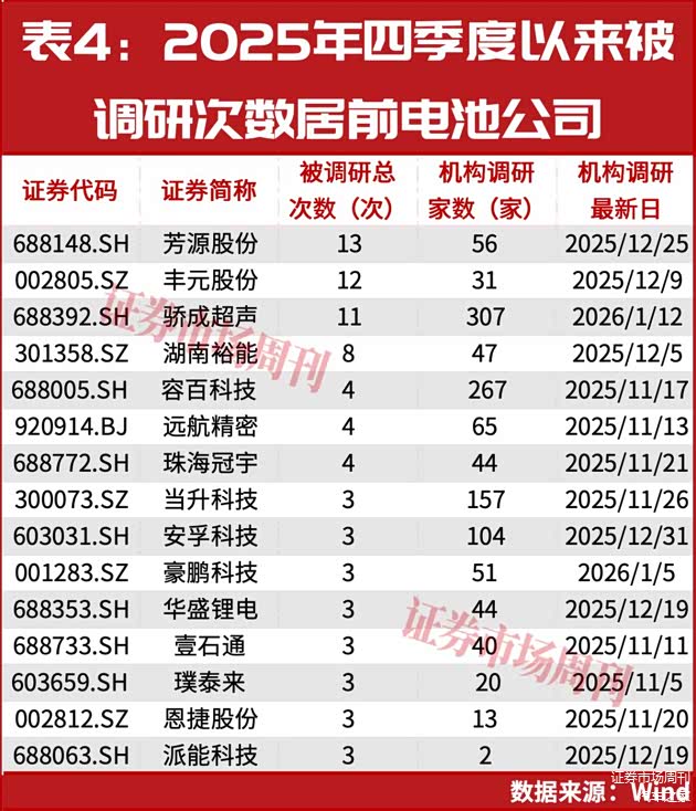 在电池公司中,芳源股份、丰元股份、骄成超声、湖南裕能、容百科技等15家公司被调研次数在3次或以上。其中芳源股份、丰元股份、骄成超声被调研次数分别有13、12、11次。