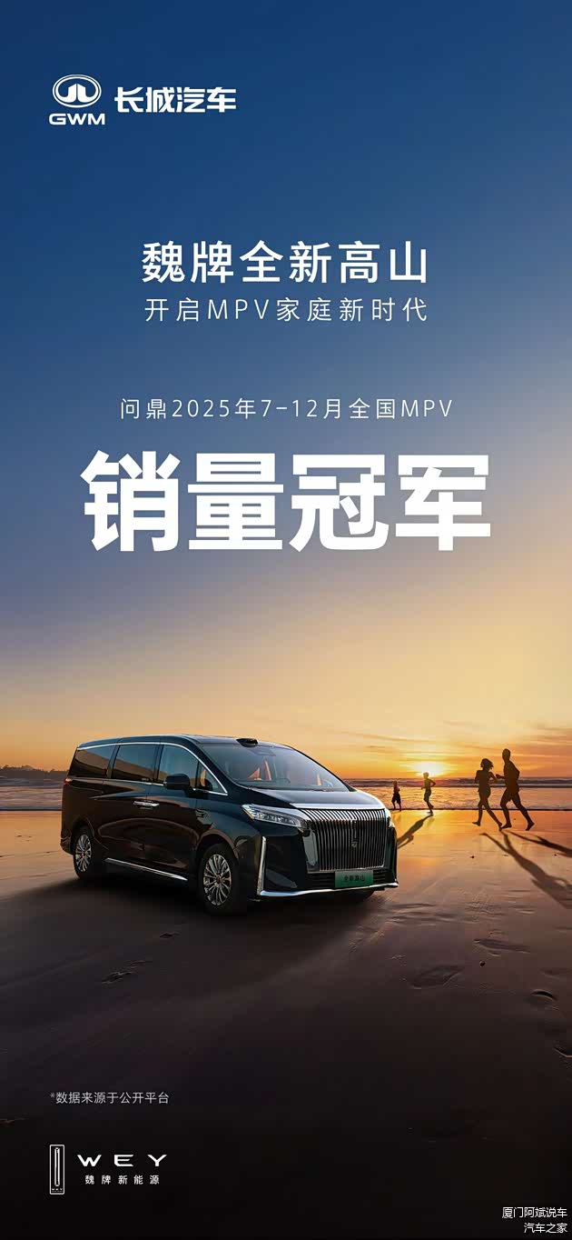 2025 年收官之时,魏牌高山交出了一份足以震撼 MPV 市场的成绩单:12 月蝉联单月销量冠军,2025 年 7-12 月斩获半年销量总冠军,“双冠” 加身的它,已然稳居 MPV 市场王者地位。这一成就不仅延续了其连续三月销量破万的强劲势头,更标志着魏牌高山完成了从 “黑马” 到引领行业结构性变革 “领头羊” 的蜕变。