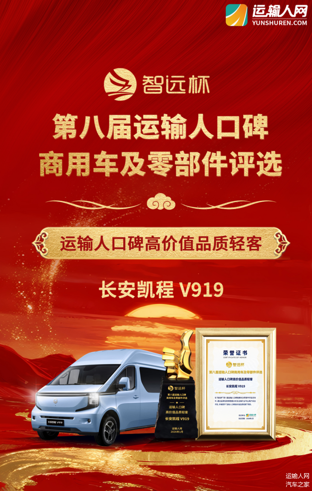 2026年1月16日,运输人网主办的第八届“智远杯”运输人口碑商用车及零部件评选线上颁奖活动隆重举行, 长安凯程V919荣获“运输人口碑高价值品质轻客”奖项。