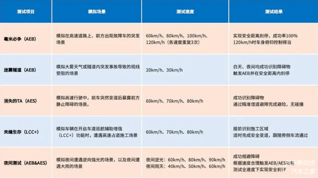 在夜间逆光场景中,长安启源Q07在各速度下均成功规避障碍,根据不同速度合理触发AEB或AES功能;夜间雨天工况下,尽管路面附着力下降,但车辆仍实现了本次测试的全速度层级的安全刹停。强光干扰和雨天湿滑路面均会影响车辆感知精度与制动效果,而测试结果表明,其主动安全系统能够适应这些极端气候条件,为全天候行车提供稳定安全保障。