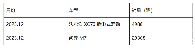 与凯迪拉克等品牌相比,沃尔沃在新能源车型里的销量,算是矬子里的大个,毕竟XC70插电式混动上市不足一年,我们以2025年12月份做比较,沃尔沃XC70插电混车型月销4988辆,算是不错的成绩,是二线豪华品牌里的佼佼者,在混动车型中,问界M7的销量,也是沃尔沃XC70插电混车型的近6倍,完全不在同一层级,后期想要追平这样的销量也并非易事,尤其在EX30电池出现热失控风险之后。