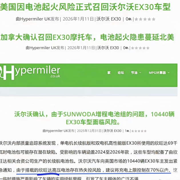现在沃尔沃已经在全球多个国家召回了3000多辆问题车辆,而英国的10440辆沃尔沃EX30,目前尚未召回,但沃尔沃给出了充电上限不要超过70%的建议,以降低自燃风险,不难看出,即便是这10440辆EX30没有被召回,但电池同样存在热失控风险。