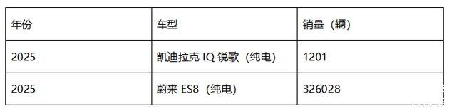 但有句话说,三十年河东,三十年河西,进入电动化时代之后,这些二线豪华品牌一下就跨到了河西,以凯迪拉克IQ锐歌全年销量1201辆,销量最高的12月为156辆,而其最差销量在2月份,月销仅仅20辆。另外一款中型纯电SUV车型IQ傲歌的销量,2025年单月最高51辆。通过图表不难看出,蔚来ES8一个月的销量,是IQ锐歌的近143倍。