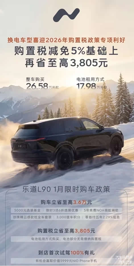 2026年的购置税新政,在延续对新能源汽车扶持基调的同时,细则更为精细。对于乐道L90这类高端纯电车型而言,“车电分离”模式展现出了强大的灵活性与经济性。